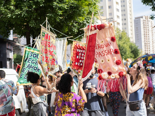 The nine banners that make up the series first came to life on the streets of São Paulo, marching alongside the carnival group Fanfarra Manada. The debut performance made a strong impact in July 2022. In its second appearance, in February 2023, the project joined forces with the energetic Bloco Calor da Rua, led by the band Francisco El Hombre, in the heart of downtown São Paulo.