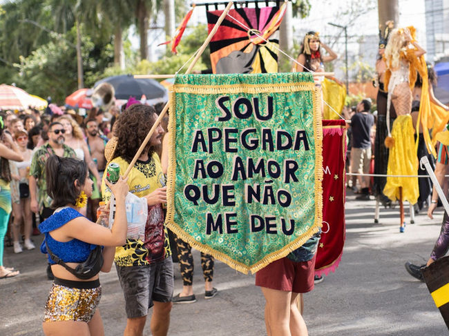 “Cortejo de Despedida” is a series of carnival banners that humorously and ironically narrate the process of a romantic breakup. Drawing on the dystopian tales of modern relationships, the phrases form an inverted carnival bloc — one that celebrates the pain of love in contemporary times.