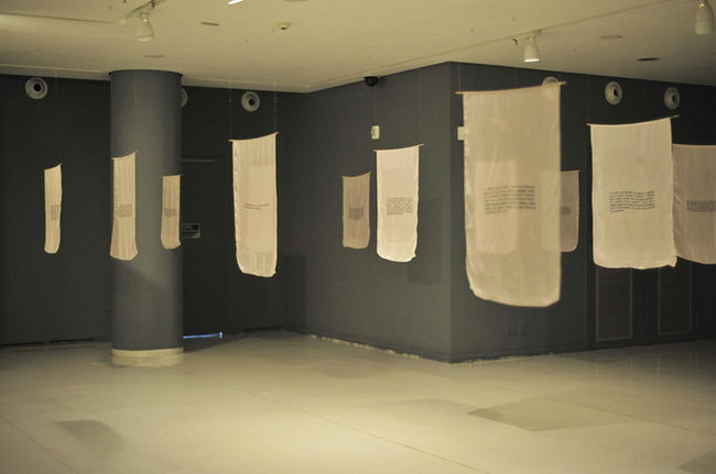 "Manual" is an installation composed of chiffon banners printed with text on their surface.The texts are testimonials from women who explain, in a technical and objective manner, how they reach orgasm. Each testimonial displayed is unique and entirely different from any other.